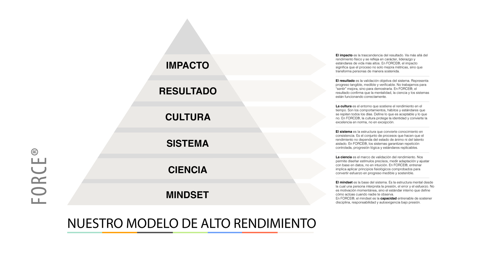 FORCE® existe para transformar el rendimiento humano a través de ciencia aplicada, metodología estructurada y mentalidad estratégica, desarrollando personas que compiten, lideran y evolucionan al más alto nivel.